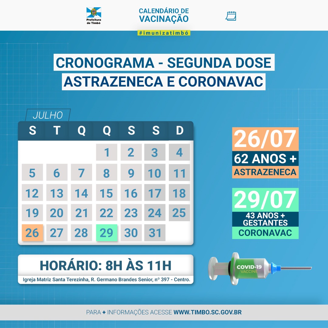 A Secretaria de Saúde informa que a partir da próxima semana vacina diversos grupos com a segunda dose da vacina contra Covid-19. Confira o cronograma completo abaixo.