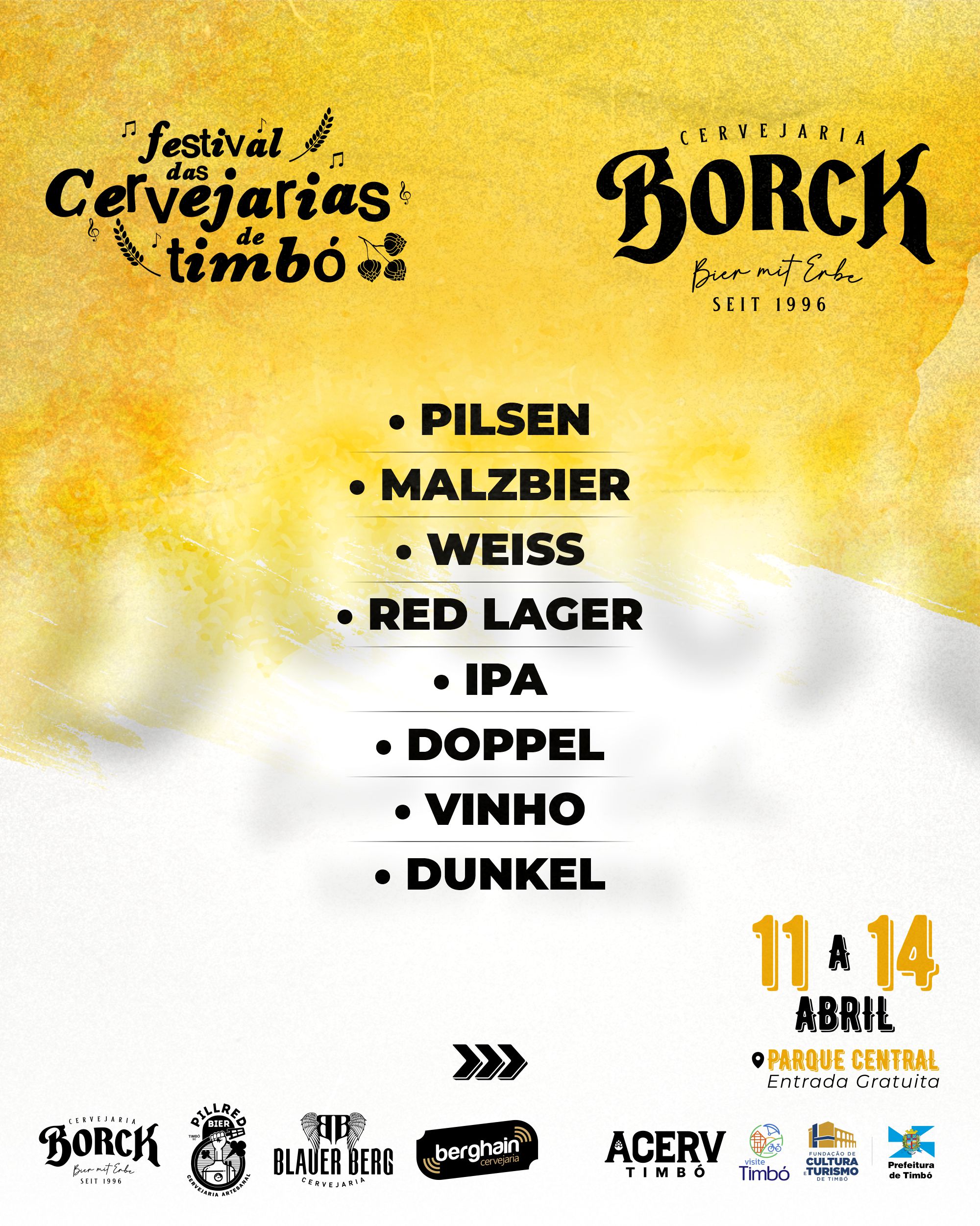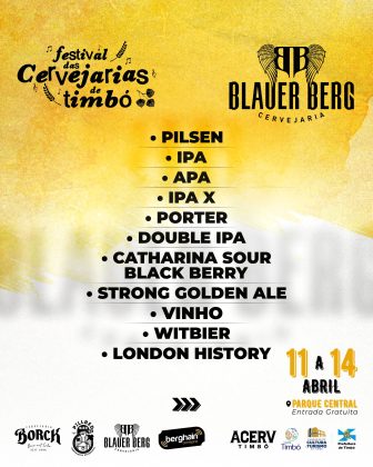 É claro que cerveja não vai faltar no Festival das Cervejarias de Timbó, que acontece entre os dias 11 e 14 de abril, no Parque Central de Timbó. Serão mais de 30 estilos, para todos os gostos.