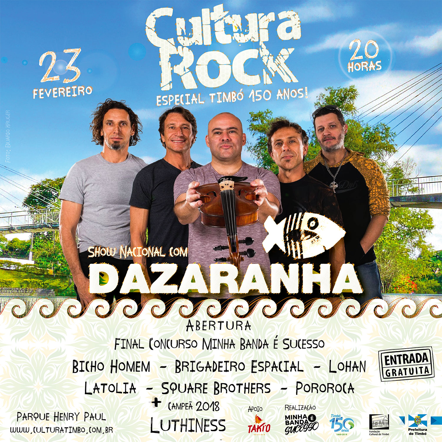 Timbó será palco de mais um Cultura Rock: referência no cenário musical da região! A 10ª edição do evento acontece no dia 23 de fevereiro, sábado, no Parque Henry Paul, e traz como atração principal o show nacional gratuito com a Banda Dazaranha, a partir das 20h. O Cultura Rock é promovido pela Prefeitura de Timbó, por meio da Fundação Cultural, e integra a programação dos 150 anos de fundação da cidade.