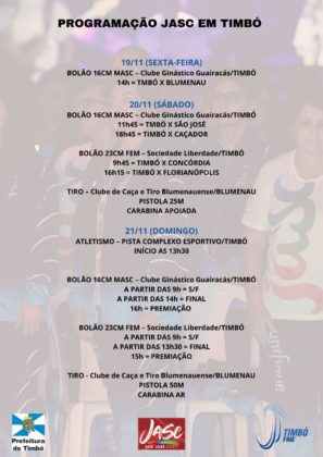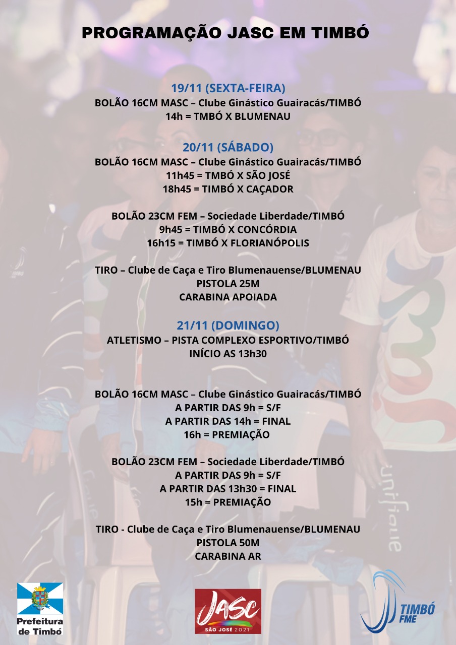 Confira abaixo o cronograma das modalidades do JASC que acontecem neste final de semana, aqui em Timbó. O evento é aberto ao público, sempre respeitando as normas de segurança contra Covid-19.