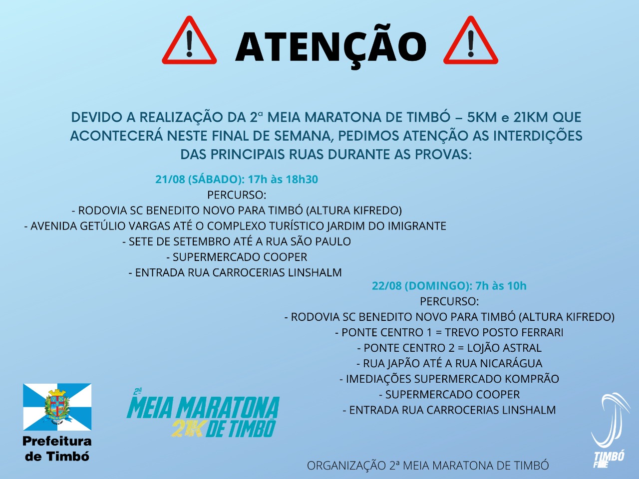 O Departamento Municipal de Trânsito (Demutran) de Timbó alerta que devido à realização da 2ª Meia Maratona de Timbó, que acontece neste final de semana, várias ruas serão parcialmente interditadas em dias e horários diferentes. Pede-se atenção, principalmente, dos motoristas. Veja como vai ser: