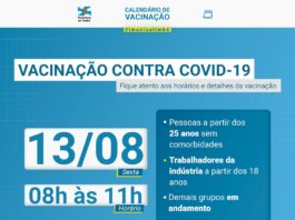 Timbó vacina nesta sexta-feira contra Covid-19 pessoas a partir dos 25 anos e trabalhadores da indústria a partir dos 18 anos