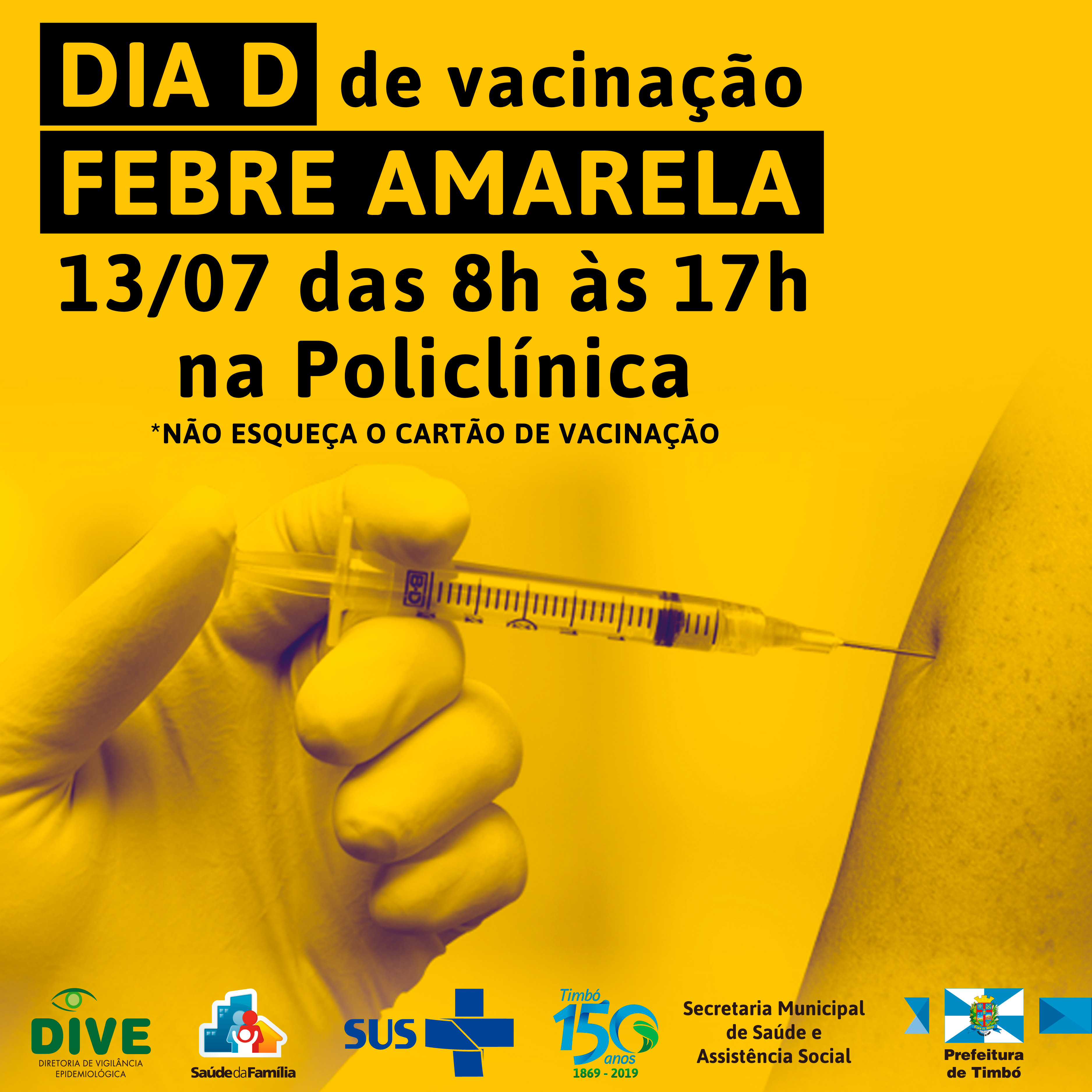 Durante todo o dia 13 de julho, sábado, acontece o dia D da Campanha de Vacinação Contra a Febre Amarela. Poderão tomar a vacina crianças a partir dos nove meses. Maiores de 60 anos precisam passar por uma avaliação médica prévia. No dia também estarão disponíveis todas as outras vacinas do calendário anual para quem precisa atualizá-las.