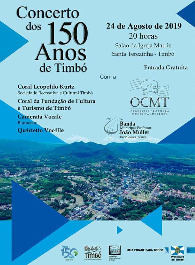 No sábado que vem, dia 24, às 20h, acontece o Concerto dos 150 Anos de Timbó. Ele será realizado no Salão de Festa da Paróquia Santa Terezinha, com entrada franca. A duração do concerto terá aproximadamente 90 minutos.