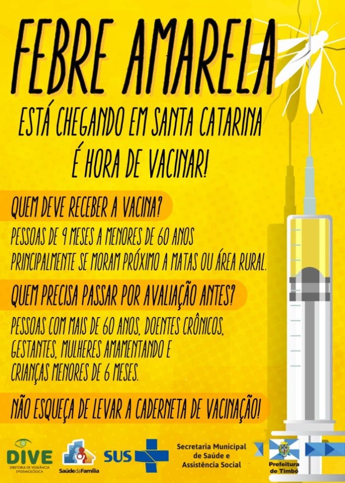 As Unidades de Saúde de Timbó estarão atendendo durante todo o dia neste sábado, dia 20 de outubro, realizando a vacinação contra a Febre Amarela e a coleta de exames preventivos do Outubro Rosa. As equipes das Unidades de Saúde dos Bairros Araponguinhas, Capitais (Solidária), Dona Clara (Avançada), Estados (Saudável), Imigrantes (Integrada), Nações, Pomeranos, Quintino (Coletiva), Tiroleses e Vila Germer irão atender das 08h às 17h, sem fechar para o almoço. Já no Bairro Pe. Martinho Stein, o Dia D será realizado no próximo sábado, dia 27.