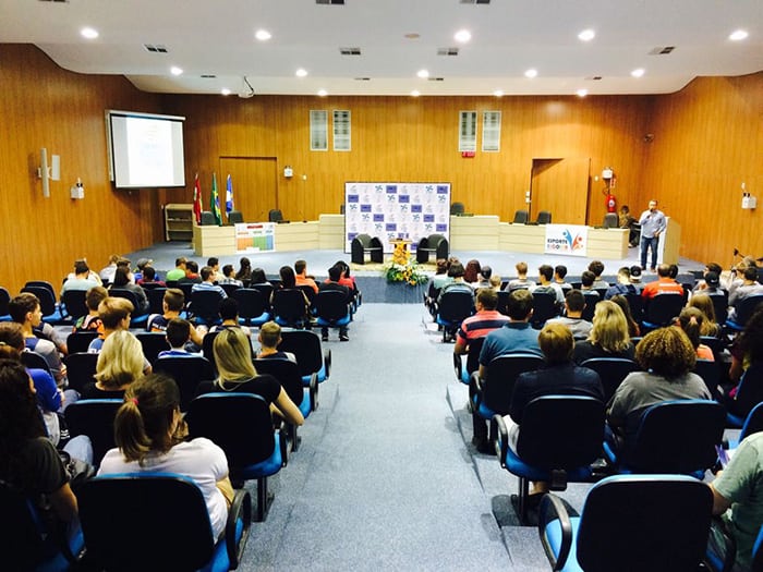 À noite, o Campeão Olímpico do Voleibol Paulão realizou uma palestra falando sobre sua experiência de vida como atleta, as atividades em equipe, os treinos e a determinação e ações necessárias para conquistar a medalha olímpica.