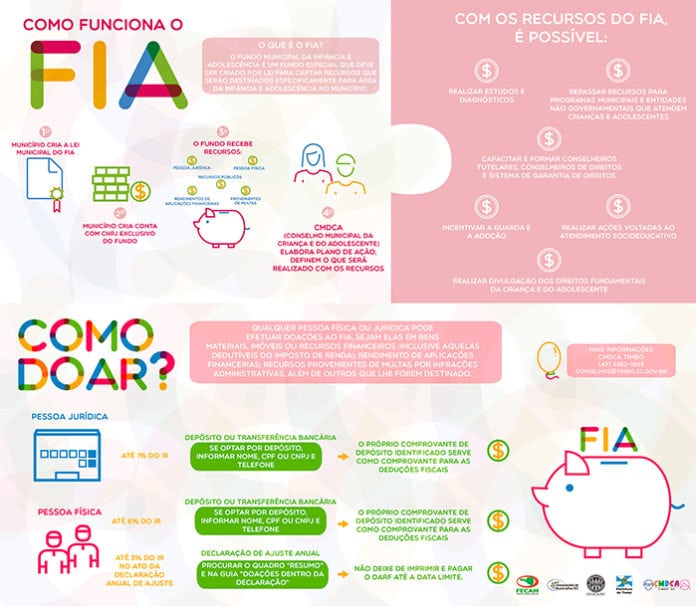 Direcione parte do seu imposto ao Fundo para a Infância e Adolescência (FIA) e auxilie a financiar projetos de defesa e promoção dos direitos de Crianças e Jovens em Timbó. Transforme o seu imposto em ação!