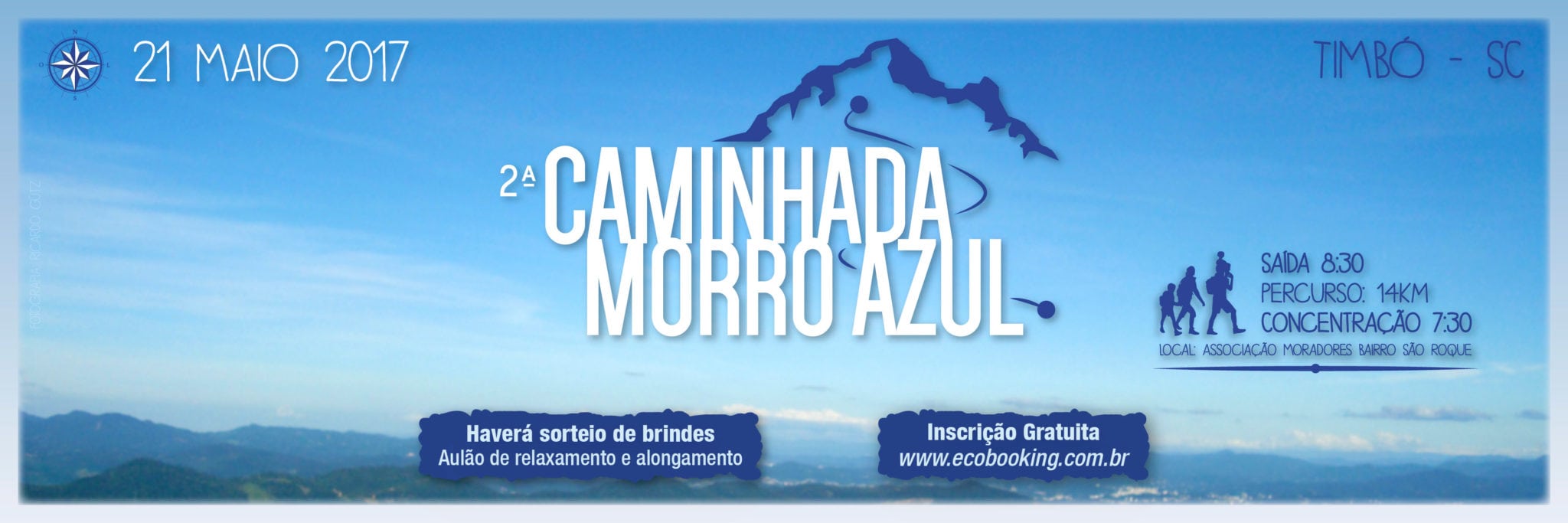 Dia 21 de maio, domingo, é dia de se encantar pelas mais belas paisagens de Timbó. É a 2ª Caminhada Morro Azul, realizada pela Prefeitura de Timbó, através do Departamento de Turismo. Serão 14km de caminhada contemplativa e diferente, com saída às 8h30 da Associação de Moradores do Bairro São Roque até o camping do Morro Azul. A concentração será a partir das 7h30. Já lá no camping, haverá aulão de relaxamento e alongamento, além de sorteio de brindes. As inscrições são gratuitas e devem ser feitas pelo site do Ecobooking (ou clicando diretamente no link http://bit.ly/2oxF0VV). Os inscritos ganharão pacotinhos com mix de grãos, cedidos pelo Pomar Urbano de Timbó. Durante o trajeto haverá pontos de apoio com água e frutas.