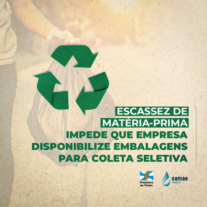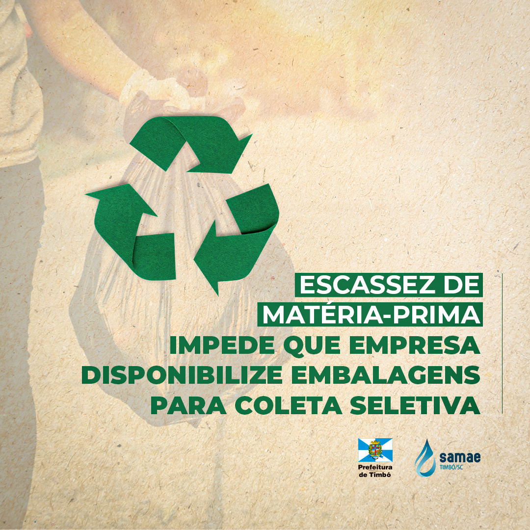O Samae Timbó informa que, devido à falta de matéria-prima, a empresa responsável pela produção das embalagens da coleta seletiva não conseguiu efetuar a entrega das mesmas à autarquia. A empresa disse ainda que essa dificuldade de conseguir a matéria-prima se agravou com a pandemia. Por essa razão, para os próximos dias não serão disponibilizadas novas embalagens nas residências e demais endereços.