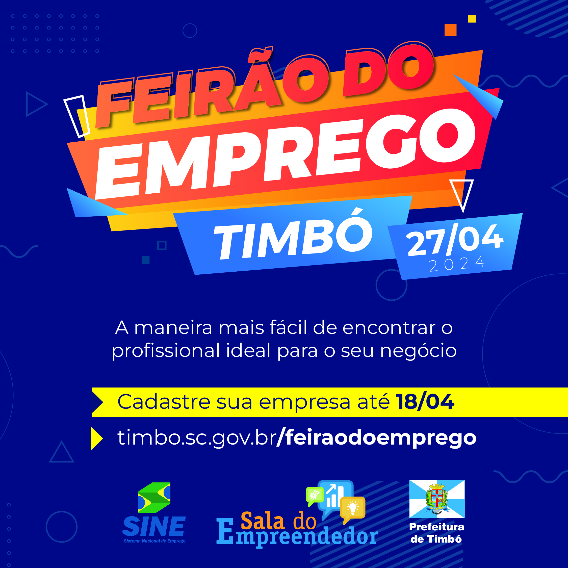No dia 27 de abril será realizada a segunda edição do Feirão do Emprego de Timbó, promovido pela Prefeitura de Timbó, através da Diretoria de Indústria, Comércio e Serviço, em parceria com o Sistema Nacional de Emprego (Sine Timbó).