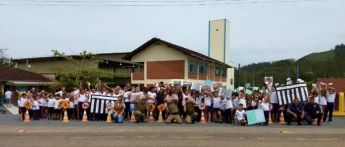 Os alunos da Escola Municipal São Roque e Unidade Pré-Escolar, UPE Comecinho de Vida realizaram na quarta-feira, dia 10, uma ação de conscientização do trânsito, entregando aos motoristas cartões de reflexões e de boas condutas no trânsito. Os materiais foram produzidos pelos próprios alunos e a atividade contou com o apoio da Polícia Militar e a Prefeitura de Timbó, por meio da Secretaria Municipal de Educação, SEMED, e do Departamento Municipal de Trânsito, Demutran.