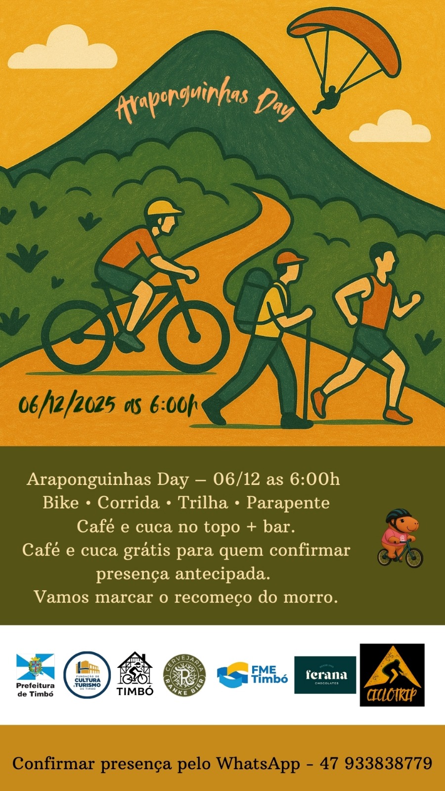 O Araponguinhas Day reforça o recomeço de uma nova fase no morro, incentivando a comunidade a usufruir do espaço de forma sustentável e celebrando a conexão com a natureza. As confirmações de presença devem ser feitas pelo WhatsApp, no número 47 93383-8779, até sexta-feira, dia 5, ao meio-dia.