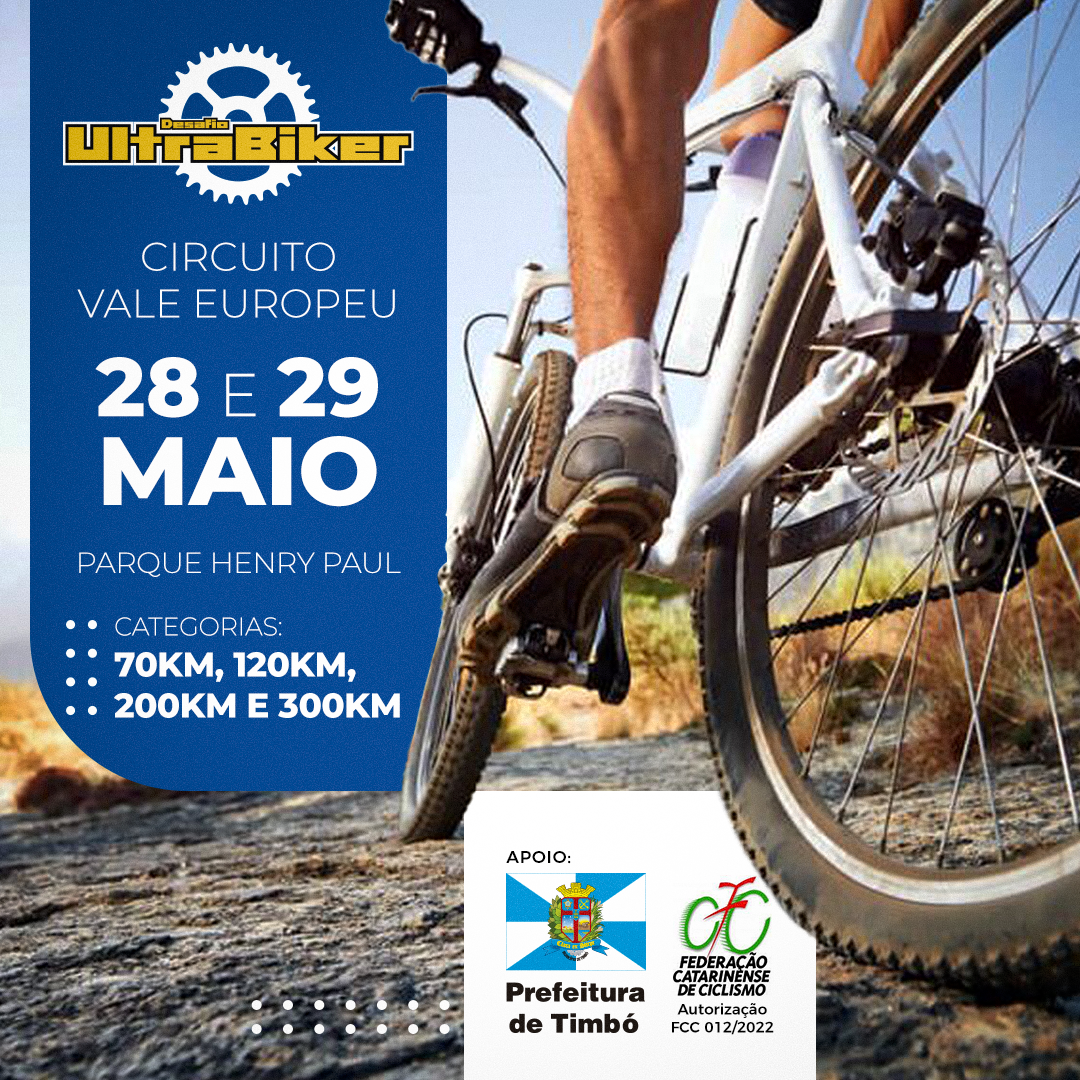 O 1º Desafio Ultrabiker no Vale Europeu acontece nos dias 28 e 29 de maio, com largada do Parque Henry Paul, em Timbó, às 6h.