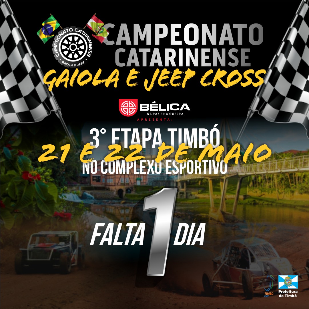 Nodias 21 e 22 de maio, Timbó recebe a 3ª Etapa do Campeonato Catarinense Gaiola e Jeep Cross. O evento acontece no Complexo Esportivo de Timbó. Já são 60 pilotos inscritos no campeonato.