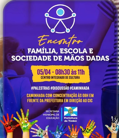A Secretaria de Educação de Timbó promove, no dia 05 de abril de 2025, o evento “Família, Escola e Sociedade de Mãos Dadas”, uma iniciativa que busca fortalecer a parceria entre comunidade, escola e família na construção de uma sociedade mais inclusiva. A programação contará com a Caminhada da Inclusão, palestras e momentos de troca de experiências, reforçando o compromisso com a igualdade de oportunidades para todas as pessoas.