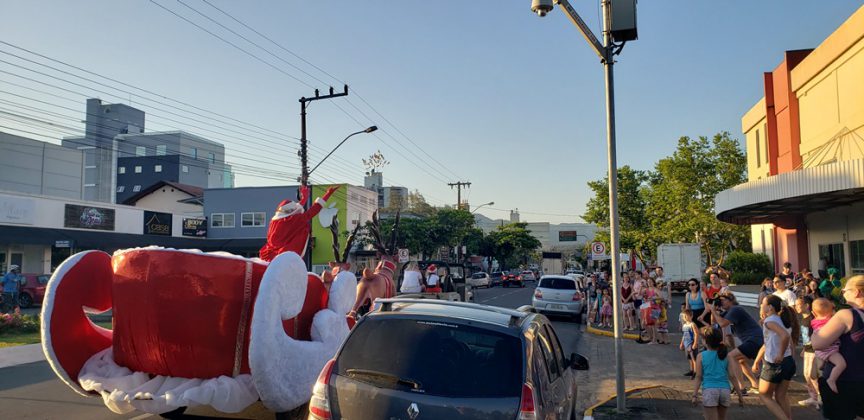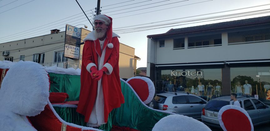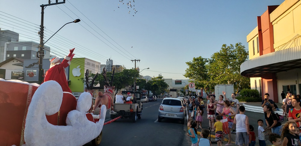 Em seguida o Papai Noel puxou a fila para o Desfile de Natal de cima de seu trenó, sendo acompanhado pelos trens de Natal da Prinz Festas, que receberam o público para o passeio, animados pelo grupo Os Cinquentões e grupo folclórico Volkstanzgruppe Blauer Berg.