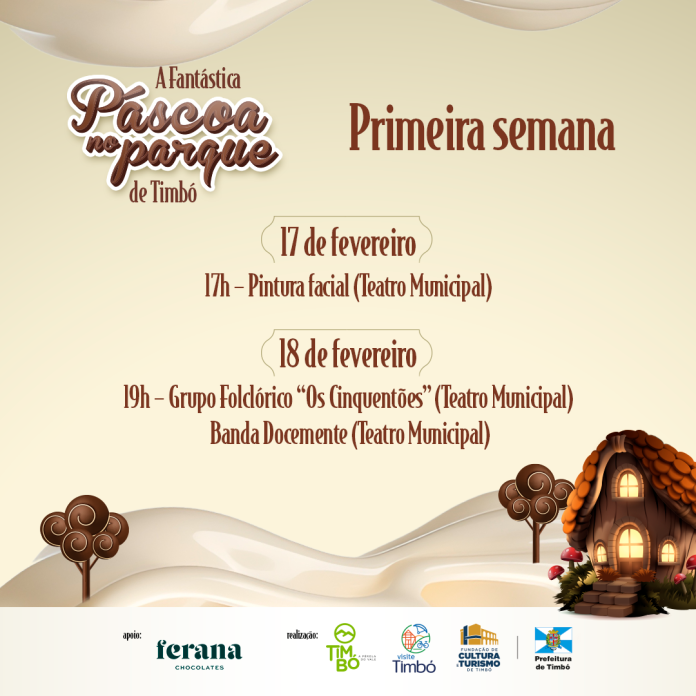 A Páscoa no Parque de Timbó está de volta. A época mais doce do ano inicia neste sábado, dia 17 de fevereiro, e segue até 01 de abril. Neste ano, o tema é a Fantástica Páscoa no Parque, em alusão ao filme A Fantástica Fábrica de Chocolates.