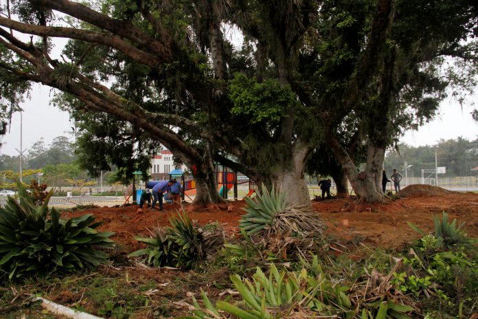 A figueira tem característica de raízes mais superficiais, por isso é necessário fazer a remoção da terra, para que não soterre e prejudique a respiração das raízes. As epífitas serão removidas por fazerem muito peso nos ramos das figueiras.