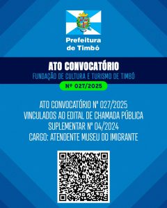 Para mais informações e detalhes sobre a documentação exigida, requisitos e atribuições do cargo, acesse o edital completo no link a seguir: https://www.timbo.sc.gov.br/wp-content/uploads/2025/05/Ato-convocatorio-027.2025-FCTT-Atendente-museu-Imigrante.pdf