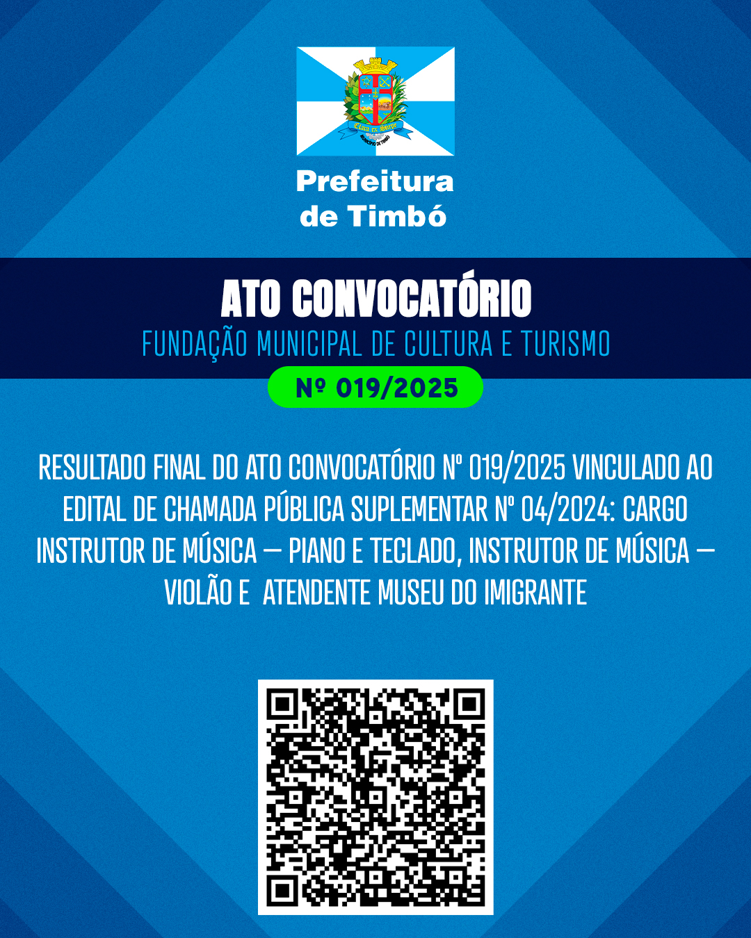 A Fundação de Cultura e Turismo de Timbó torna público o resultado final do Ato Convocatório nº 019/2025, vinculado ao Edital de Chamada Pública Suplementar nº 04/2024. A seleção, realizada no dia 04 de abril de 2025, teve como objetivo o preenchimento de vagas para atuação em atividades culturais e educacionais oferecidas pela instituição à comunidade.