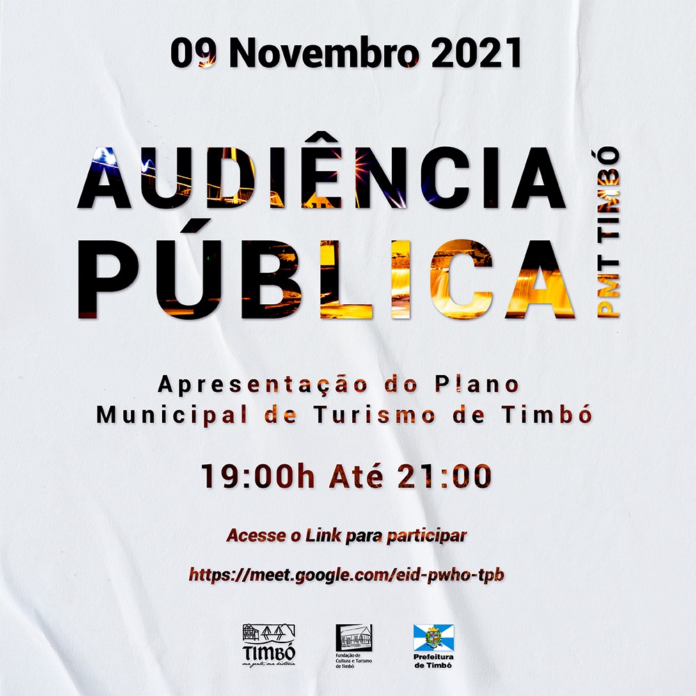 A Prefeitura de Timbó, através da Fundação de Cultura e Turismo, realiza no dia 09 de novembro Audiência Pública para apresentação do Plano Municipal de Turismo de Timbó. Toda a comunidade timboense está convidada a participar.