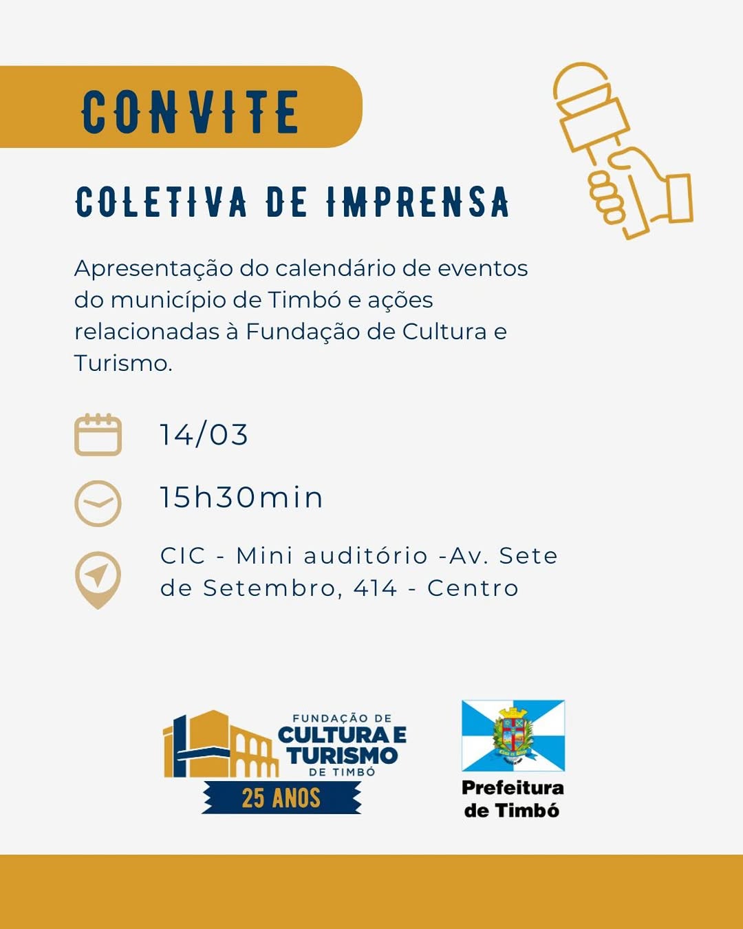 Nesta sexta-feira (14/03), a Prefeitura de Timbó, através da Fundação de Cultura e Turismo, realizará uma coletiva de imprensa para divulgação do calendário de evento do município para 2025. Na oportunidade a FCTT irá falar também das novas ações previstas para este ano e das já realizadas até aqui.