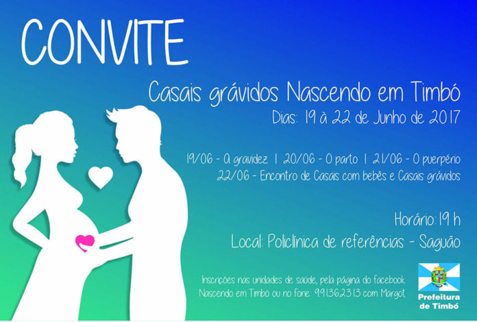 No dia 19 de junho, segunda-feira, a Secretaria de Saúde através do Grupo Nascendo em Timbó, inicia uma nova turma do curso de Casais Grávidos. Os encontros são abertos a todos os casais grávidos e interessados, como avôs, avós e familiares. Seguem até o dia 22 de junho, na Policlínica, de 2ª a 5ª feira, das 19h às 21h. O curso é gratuito.