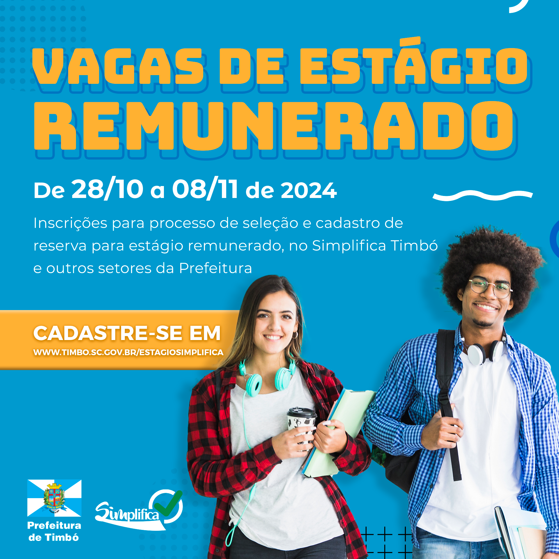 Estão abertas as inscrições do processo seletivo de estágio remunerado e cadastro de reserva, para atuar no Simplifica Timbó e outros setores da Prefeitura.