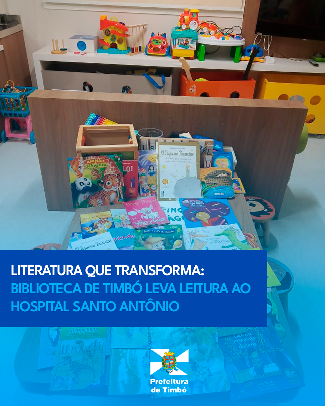 A Biblioteca Pública Municipal Professor Péricles Prade realizou uma ação social de grande impacto por meio do projeto literário Bibliotecando a Leitura de Timbó a Blumenau no Hospital Santo Antônio. A iniciativa promoveu a doação de um acervo com 40 livros infantis e infantojuvenis para o setor de Oncologia, oferecendo aos pacientes e suas famílias momentos de distração, conforto e incentivo à leitura durante o tratamento.