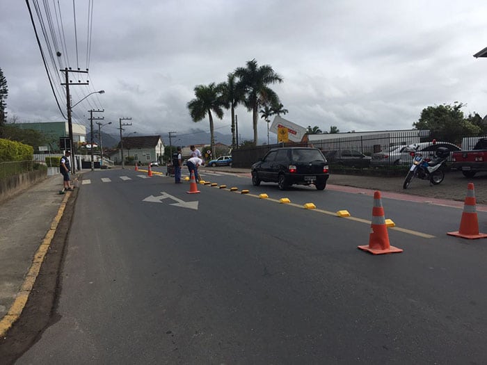 O Departamento Municipal de Trânsito – Demutran de Timbó, atendendo a um pedido da comunidade, realizou nesta sexta-feira, 1º de setembro, um trabalho de melhoria na entrada da Rua Espírito Santo, na esquina com a Rua Blumenau, no Bairro dos Estados. No local foram registrados vários acidentes de menor gravidade, em virtude da parada de veículos para entrar na rua. Além da colocação de tachões no eixo principal da Rua Blumenau foi melhorada a sinalização vertical.