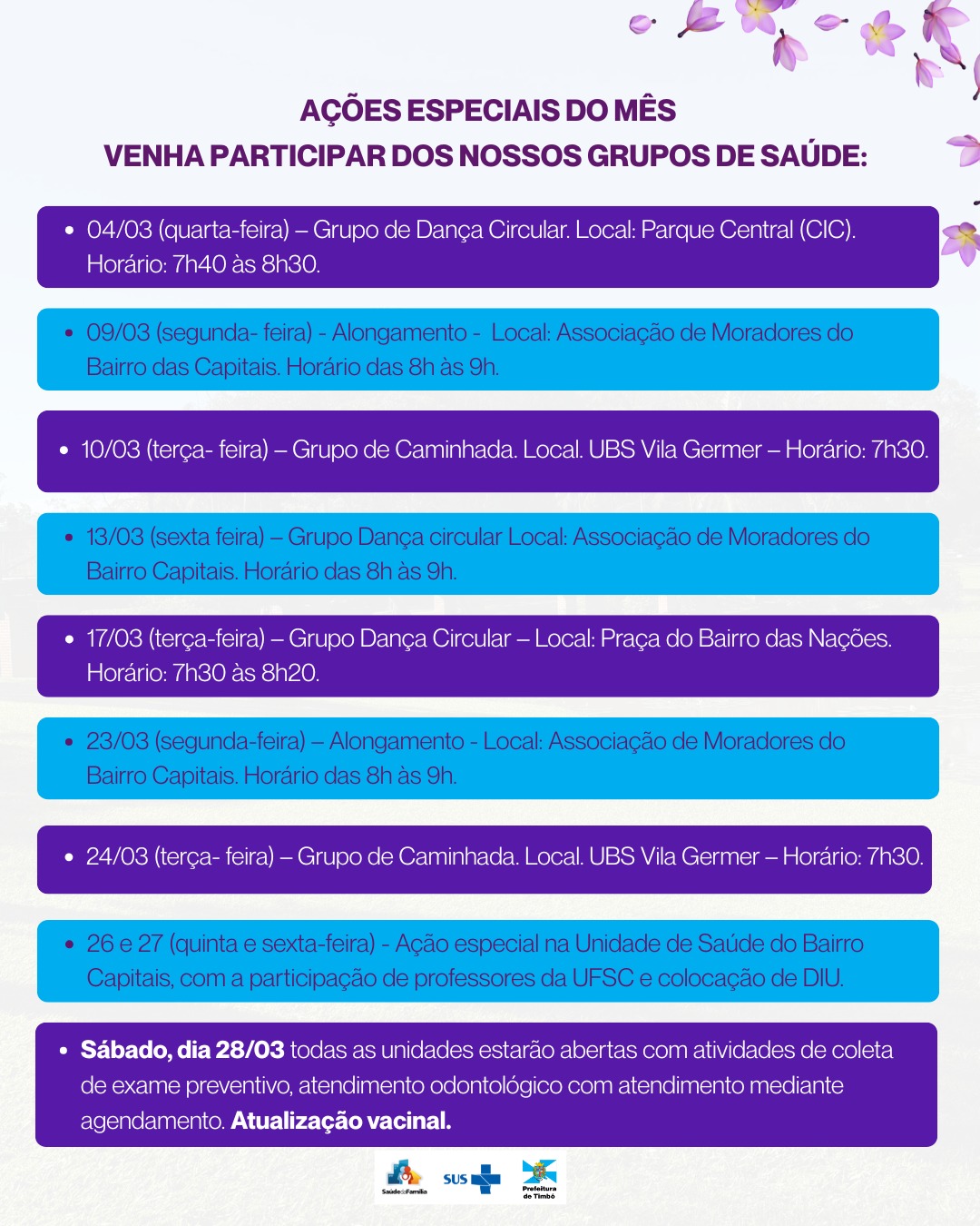 26 e 27/03 (quinta e sexta-feira) – Ação especial na Unidade de Saúde do Bairro Capitais, com a participação de professores da UFSC e colocação de DIU.