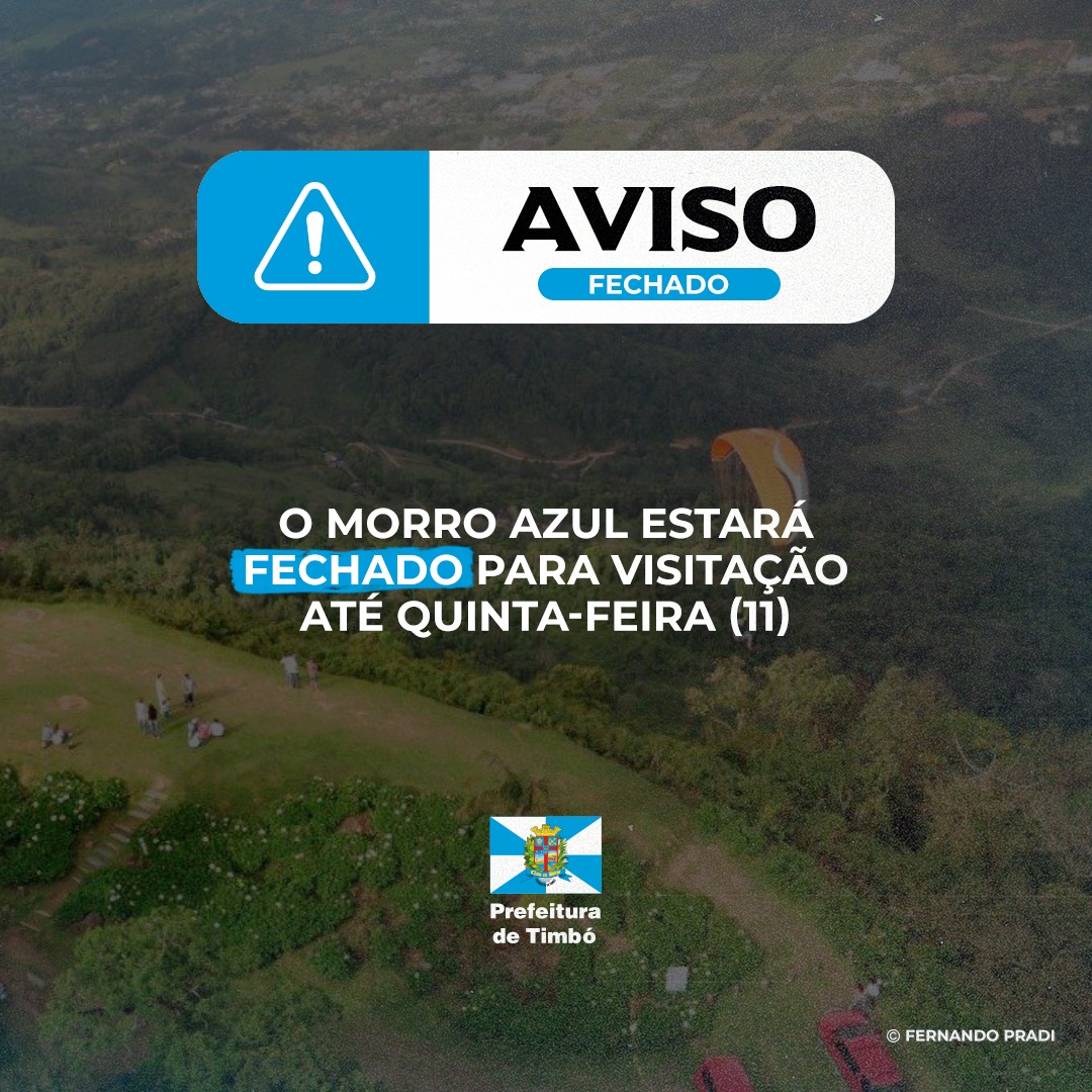 A Prefeitura de Timbó informa que, devido ao atraso na entrega da concretagem para realizar a pavimentação no trecho final do morro, as obras seguem até nesta quinta-feira, dia 11. Não haverá também possibilidade de usar o camping nesse período. A partir de sexta-feira, dia 12, o parque volta a ser aberto normalmente.
