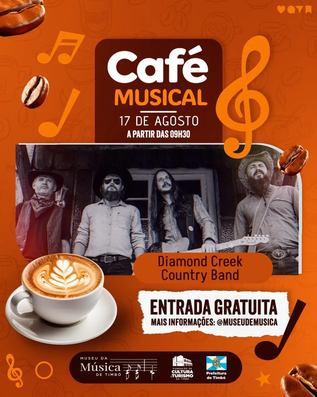O Museu da Música de Timbó promove neste domingo, dia 17, mais uma edição especial do Café Musical. A manhã será animada pela banda Diamond Creek, que promete envolver o público com toda a energia do country e o clima do faroeste, em uma apresentação de graça e aberta à comunidade.
