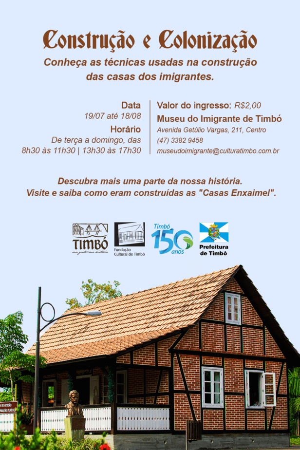 O Museu do Imigrante de Timbó promove a exposição Construção e Colonização. Nela serão apresentadas técnicas usadas na construção das casas dos imigrantes timboenses. A exposição acontece de 19 de julho a 18 de agosto, de terça a domingo, das 8h30 às 11h30 min e das 13h30 às 17h30min.