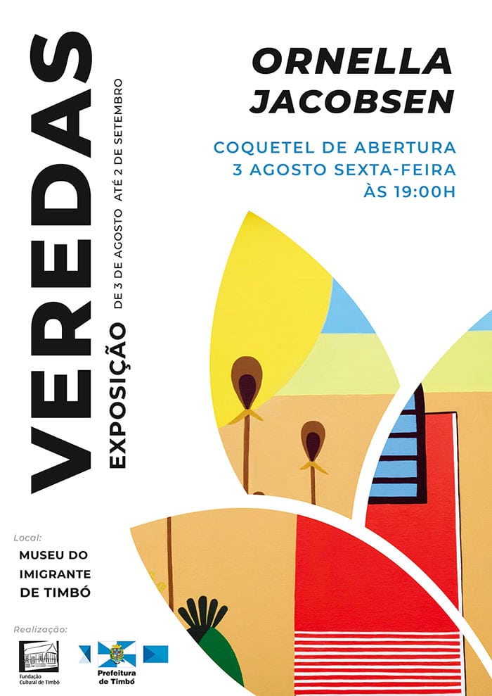 De 03 de agosto a 02 de setembro, o Museu do Imigrante de Timbó recebe a Exposição Veredas, da artista plástica timboense Ornella Jacobsen. Cores vibrantes marcam os trabalhos da artista, produzidos em óleo sobre tela, e revelam um plano imaginário aliado à percepção da vida, objetos, natureza, etc. O coquetel de abertura acontece na sexta-feira, dia 03, a partir das 19h, e é aberto ao público.