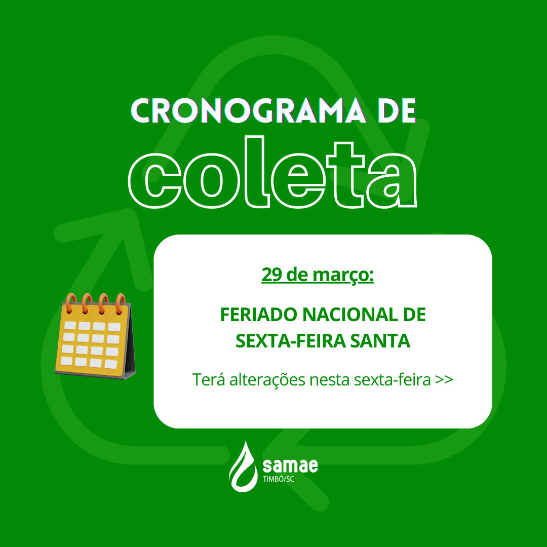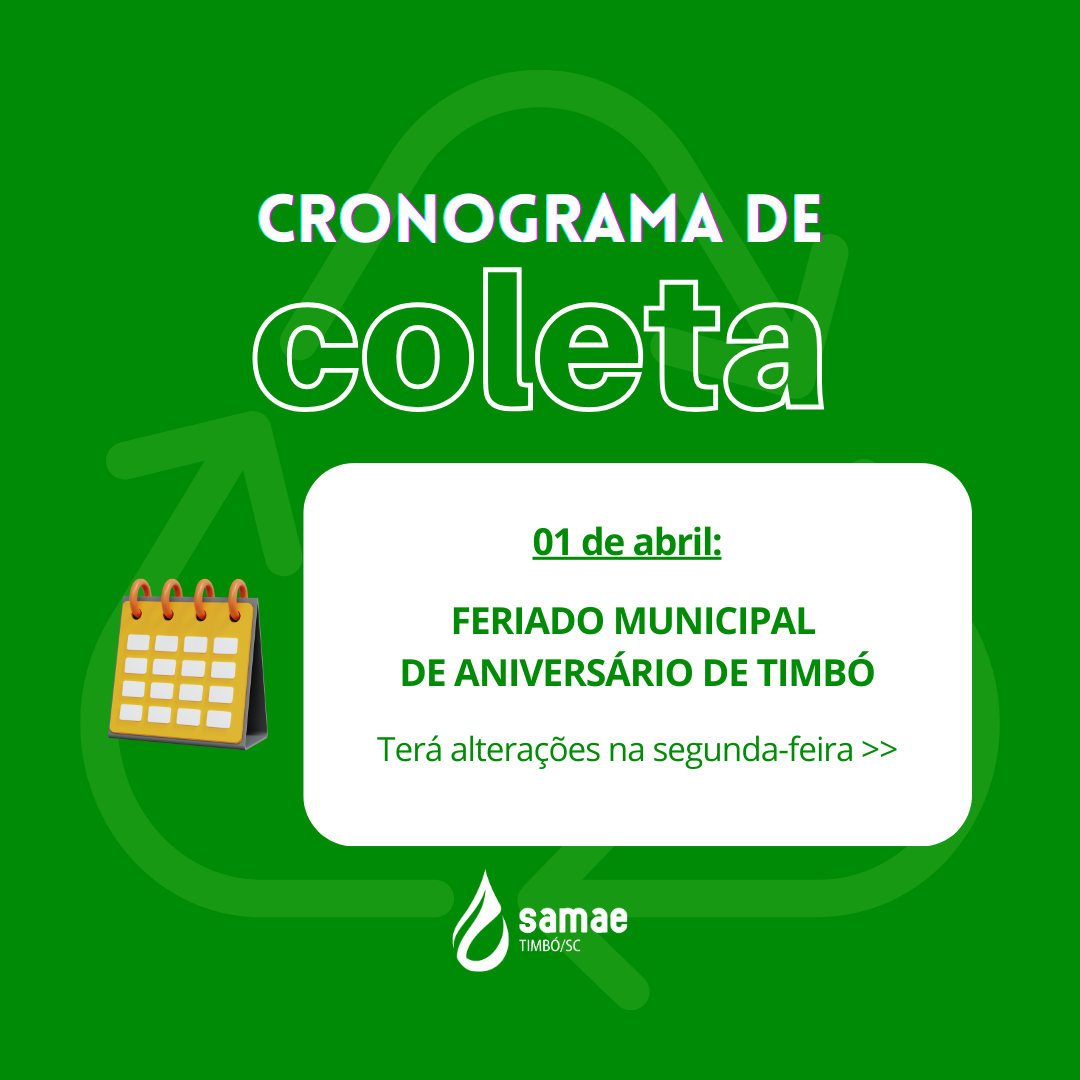 O SAMAE Timbó informa que, devido ao feriado nacional da Sexta-Feira Santa e também feriado municipal de aniversário de Timbó, haverá mudanças no cronograma de coleta nos dias 29 de março e 01 de abril. Confira: