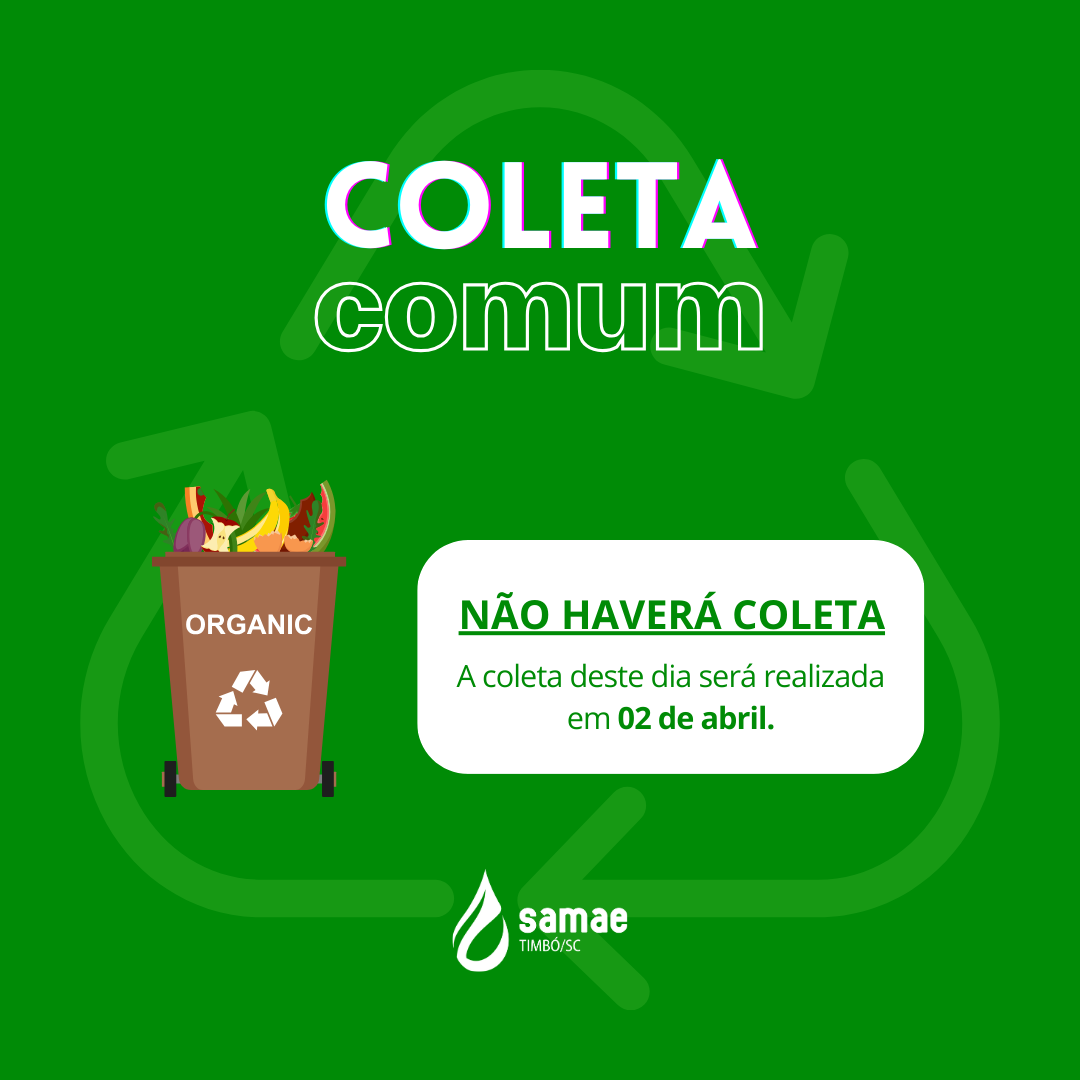 Não haverá coleta de resíduos orgânicos (Pomeranos, São Roque, Quintino, Vila Germer, Fritz Lorenz, Araponguinhas, Estados e Padre Martinho Stein). A coleta deste dia será realizada dia 02 de abril, próxima terça-feira.