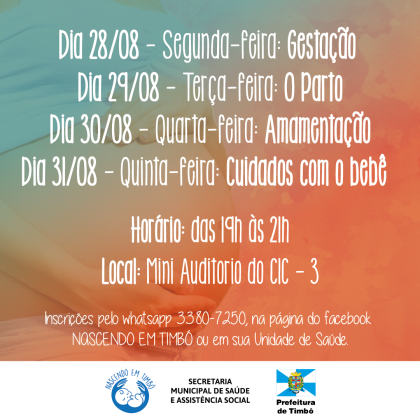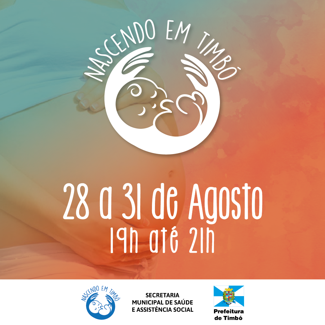 Aos papais e mamães, entre os dias 28 a 31 de agosto acontece mais uma edição do projeto Nascendo em Timbó, promovido pela Prefeitura de Timbó, através Secretaria Municipal de Saúde e Assistência Social.