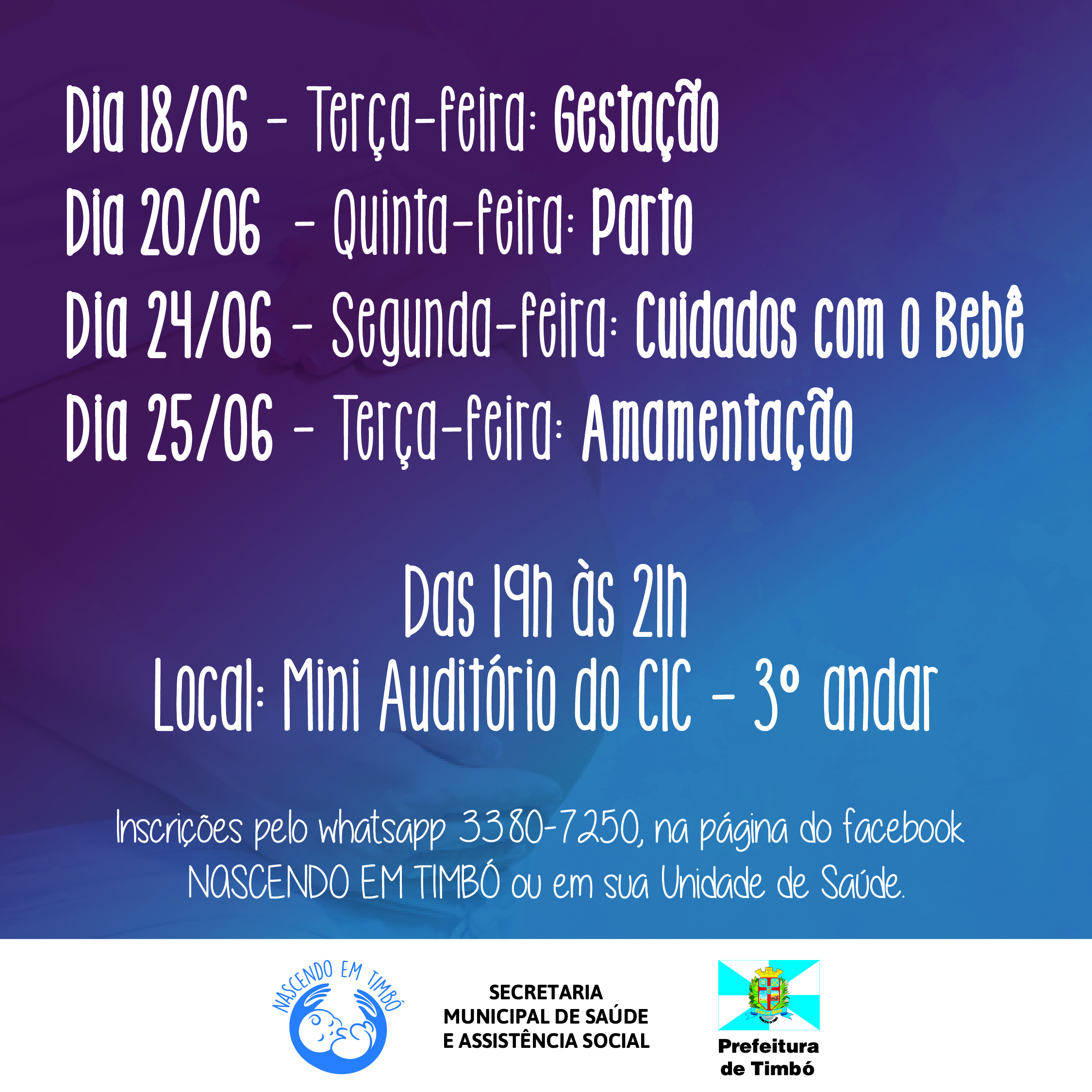 Aos papais e mamães, nos dias 18, 20, 24 e 25 de junho acontece mais uma edição do projeto Nascendo em Timbó, promovido pela Prefeitura de Timbó, através Secretaria Municipal de Saúde e Assistência Social.