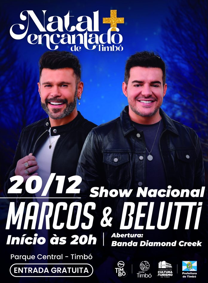 Um dos momentos sempre muito aguardados é o show nacional na programação do Natal Mais Encantado de Timbó. Neste ano, quem agitará o palco do Parque Central será a dupla sertaneja Marcos e Belutti.