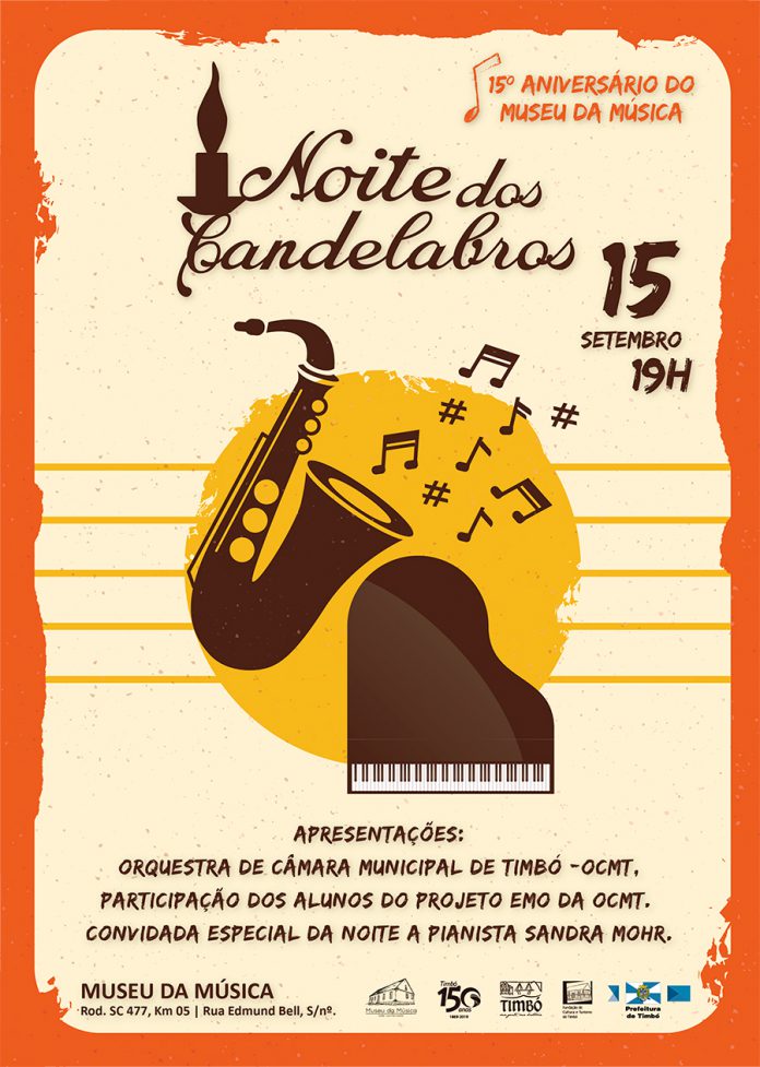 Dia 15 de setembro acontece a 11ª edição da Noite dos Candelabros, no Museu da Música de Timbó. O evento é promovido pela Fundação Cultural desde 2009 e traz ao público um pouco da música clássica mundial e nacional e também celebra o aniversário de 15 anos do Museu da Música de Timbó.