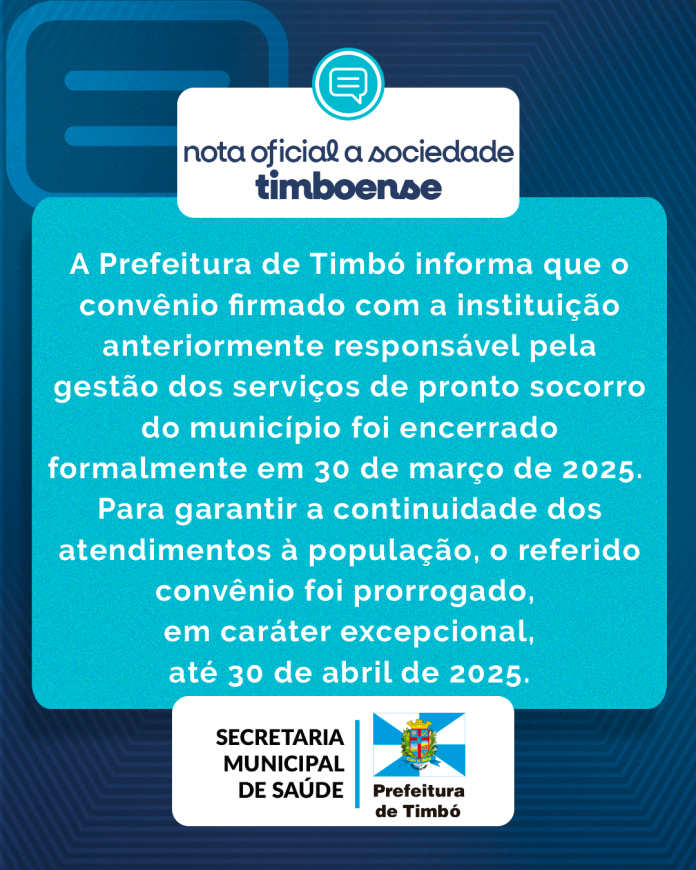 A Prefeitura de Timbó informa que o convênio firmado com a instituição anteriormente responsável pela gestão dos serviços de pronto socorro do município foi encerrado formalmente em 30 de março de 2025. Para garantir a continuidade dos atendimentos à população, o referido convênio foi prorrogado, em caráter excepcional, até 30 de abril de 2025.