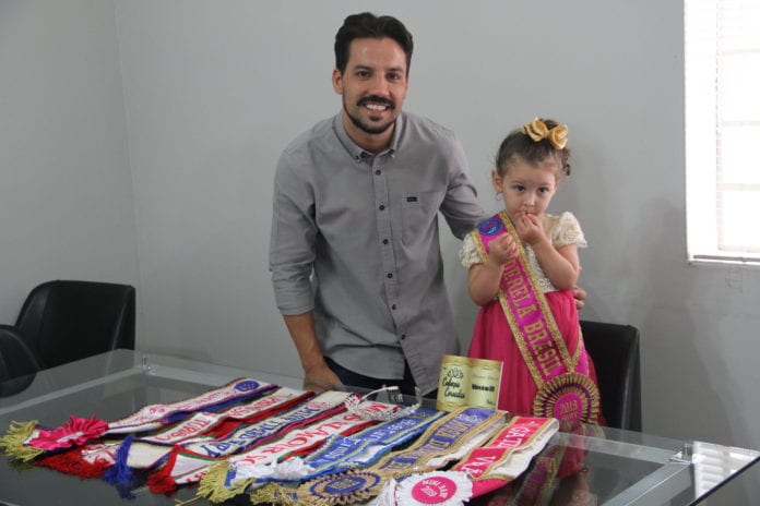 A pequena timboense Yasmin Ribeiro, de 2 anos e 07 meses, irá representar o Brasil na categoria baby da 16ª edição do Miss Mercosul Internacional, no dia 23 de março, em Tijucas-SC. Yasmin, que já coleciona oito títulos em concursos de beleza, visitou o gabinete do prefeito Jorge Kruger na manhã de hoje, dia 12, junto da mãe, Terezinha Franzen.