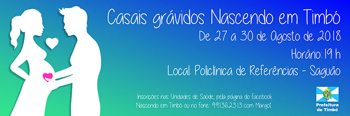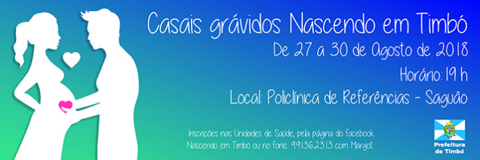 De 27 a 30 de agosto, a Policlínica de Referências receberá nova edição do curso Casais Grávidos Nascendo em Timbó. A ação é promovida pela Secretaria de Saúde de Timbó, e tem o objetivo de capacitar futuras mamães e papais para a chegada de um bebê. Os encontros acontecerão no saguão da Policlínica, das 19 às 21h, e serão abertos a toda a comunidade. Gravidez, parto, amamentação, planejamento familiar, e alimentação da gestante e da criança são alguns dos assuntos a serem trabalhados pela equipe multiprofissional da Secretaria de Saúde de Timbó.