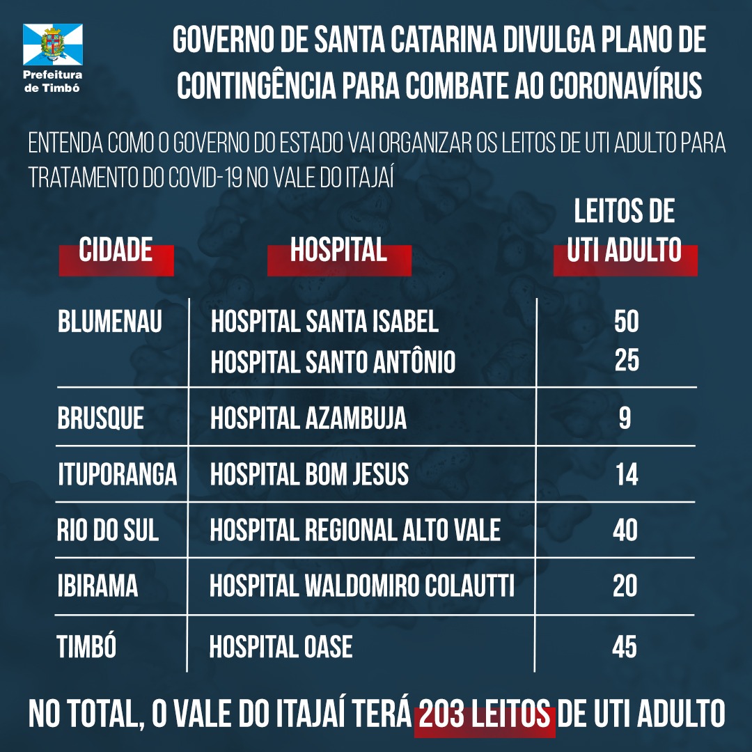 O Governo de Santa Catarina anunciou o Plano de Contingência em resposta às emergências em Saúde Pública causadas pelo Coronavírus (Covid-19) no estado. No Plano, está definido que a região do Vale do Itajaí irá ter 203 leitos de Unidade de Terapia Intensiva (UTI) Adultos para intensificar o combate e tratamento às vítimas do Coronavírus, sendo 45 deles no Hospital e Maternidade Oase, que fará exclusivamente atendimentos às pessoas que são vítimas do vírus e estão em estado grave.