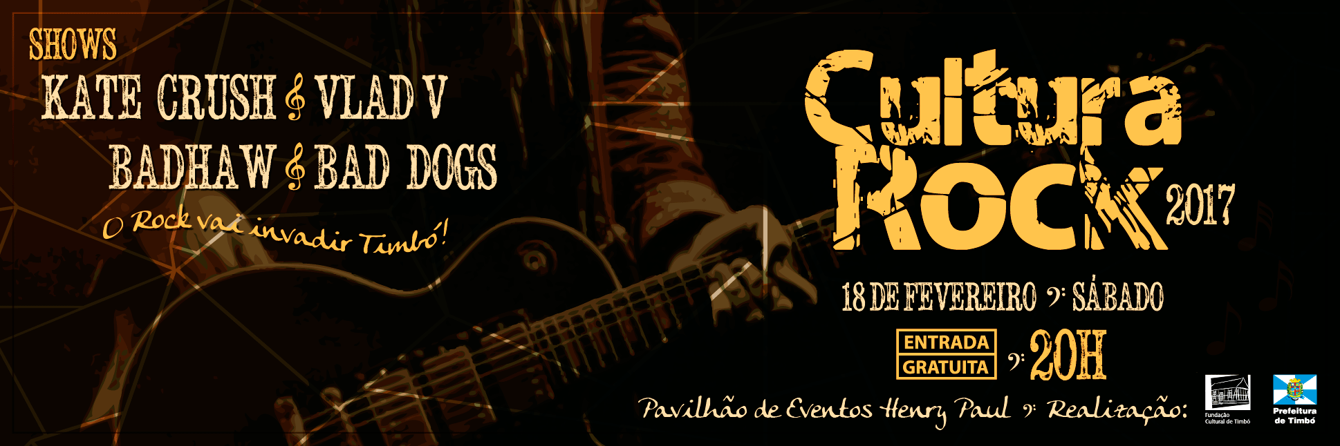 No dia 18 de fevereiro, sábado, o Pavilhão de Eventos Henry Paul vai ser dominado pelo rocknroll. É a VIII edição do Cultura Rock, realizado pela Prefeitura de Timbó, através da Fundação Cultural. O evento tem início às 20h, com entrada gratuita e contará com apresentação de quatro bandas: Bad Dogs, Badhaw, Kate Crush e Vlad V. Além do verdadeiro show de solos de guitarras, a edição deste ano contará com as algumas novidades para o público.