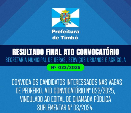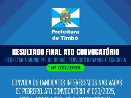 Timbó divulga resultado final do Ato Convocatório nº 023/2025 para contratação...