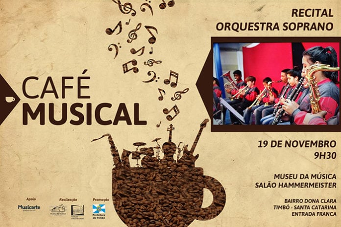 No dia 19 de novembro, domingo, a Prefeitura de Timbó através do Museu da Música recebe uma atração especial no Café Musical, a Orquestra Soprano, do CAIC Nossa Senhora dos Prazeres, que faz parte do projeto Música na Escola, da Secretaria de Educação de Lages. O projeto tem como objetivo estimular a formação musical de alunos da rede pública municipal de ensino, demonstrando o poder educativo e transformador da música em suas vidas.