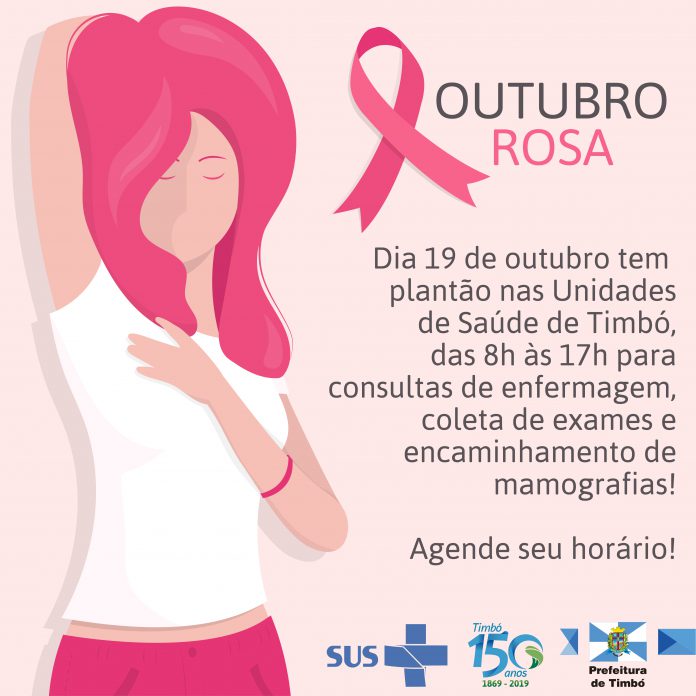No dia 19 deste mês de outubro, um sábado, acontece o dia D da prevenção da mulher no Outubro Rosa de Timbó. Neste dia todos as Unidades de Saúde da Família estarão atendendo as mulheres das 8h às 17h.
