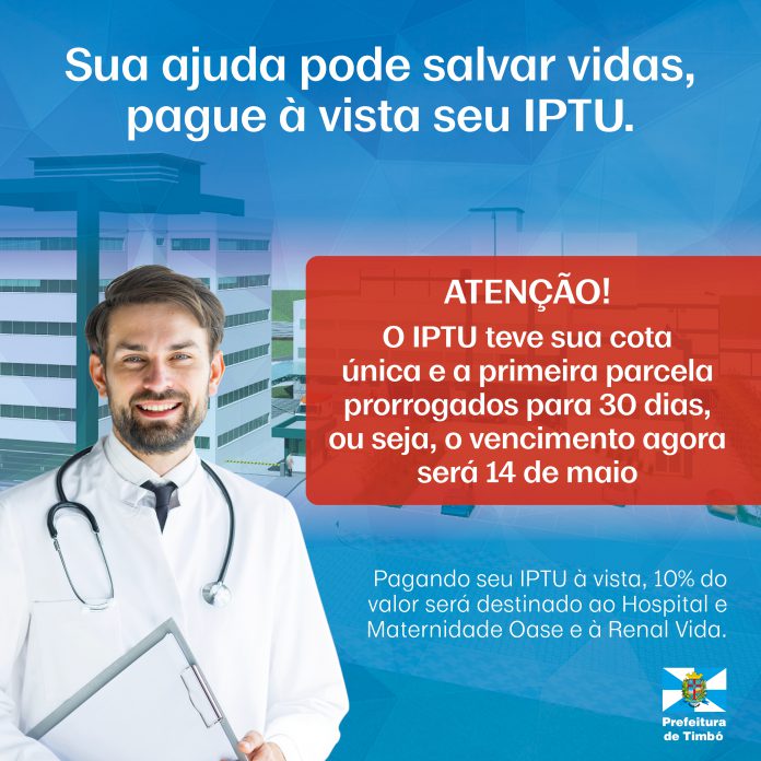 Diante da atual situação que vivemos em decorrência do Coronavírus (Covid-19), e para cooperar com as dificuldades financeiras que possam vir a acarretar, a Prefeitura de Timbó decidiu prorrogar em 30 dias o pagamento do IPTU. A cota única e a primeira parcela que estavam marcadas para 14 de abril, agora, vencem em 14 de maio. Além disso, o pedido se isenção que é feito diretamente na Prefeitura e segue o mesmo prazo do IPTU, também teve seu prazo prorrogado para 14 de maio.